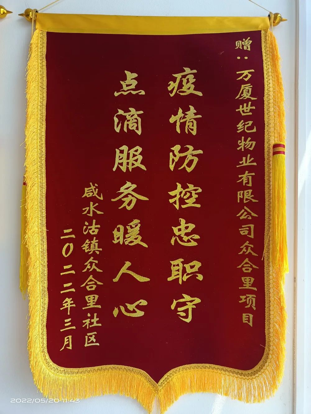 淀山湖壹號與上海僅一湖之隔 許多業(yè)主無法回到小區(qū) 為此,物業(yè)工作人員特地為 無法歸家的業(yè)主提供了幫助 業(yè)主為感謝物業(yè)員工 在疫情封控期間堅守崗位 “防疫、服務”兩不誤 特地寄送了錦旗