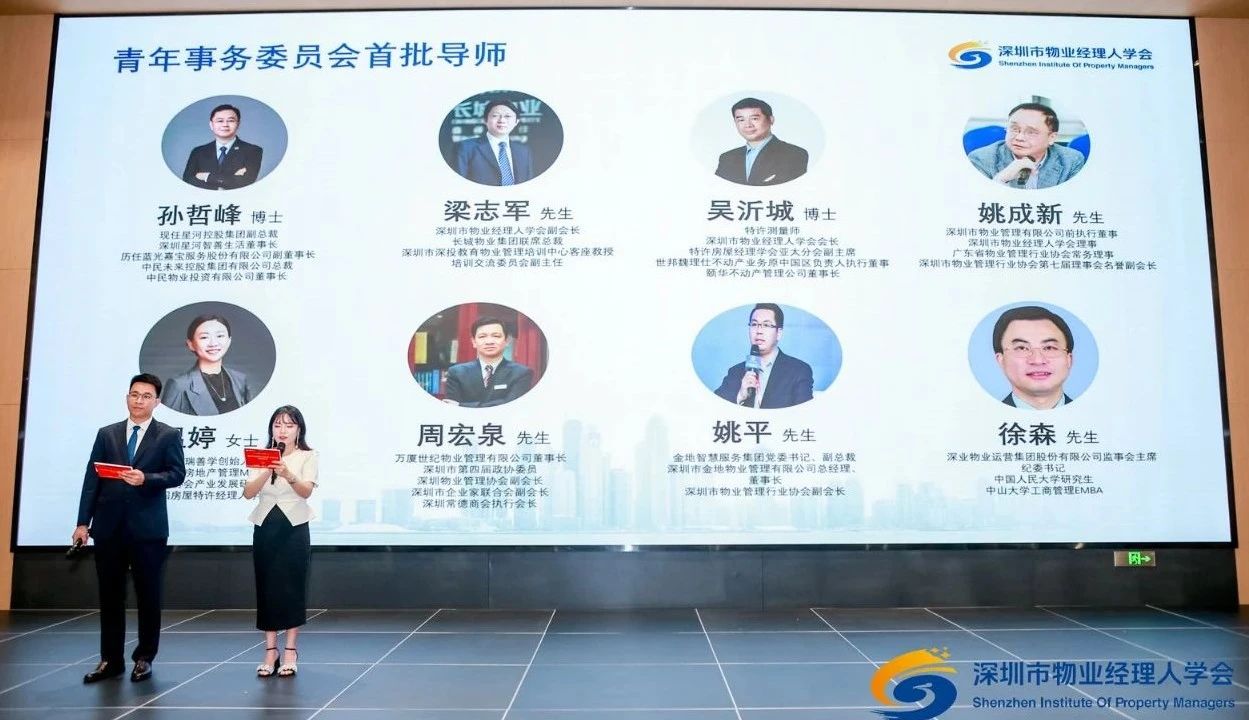吳沂城博士(學(xué)會(huì)會(huì)長(zhǎng))、梁志軍先生(長(zhǎng)城物業(yè)聯(lián)席總裁)、孫哲峰博士(星河智善生活董事長(zhǎng))、姚平先生(金地智慧服務(wù)集團(tuán)黨委書記兼副總裁)、徐森先生(深業(yè)物業(yè)運(yùn)營(yíng)集團(tuán)紀(jì)委書記)、周宏泉先生(萬(wàn)廈世紀(jì)物業(yè)董事長(zhǎng))、溫婷女士(璞瑞資產(chǎn)管理董事長(zhǎng))、姚成新先生(深圳市物業(yè)管理有限公司前執(zhí)行董事)。